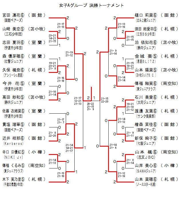 | GA-6 | ]•Ê‚a‚r”N’c[ŽD–y] | {“cŒ‹ˆ¤‰H‡D | ‚Q | 21-15 21-15 | ‚O | ”‘ˆË’m‰Ô‡E | ÓàJr.[“Ϭ–q] | |