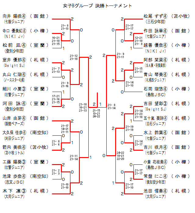 | GB-21 | SA東・羽C.[札幌] | 阿部栞菜C | 2 | 21- 9 21-11 | 0 | 松尾すずC | 三石少年団[苫小牧] | |
