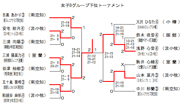 | GBL-12 | 港南飛翔Jr.[室蘭] | 三浦陽菜乃C | 2 | 21-12 15-21 21-12 | 1 | 浅野心音C | 苫小牧リトル[苫小牧] | |