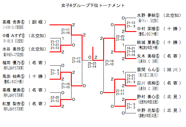 | GAL-6 | 心奏羽B.C.[名寄] | 白川咲絢D | 2 | 15-21 21-17 21- 9 | 1 | 扇間らんD | 旭川近二[旭川] | |
