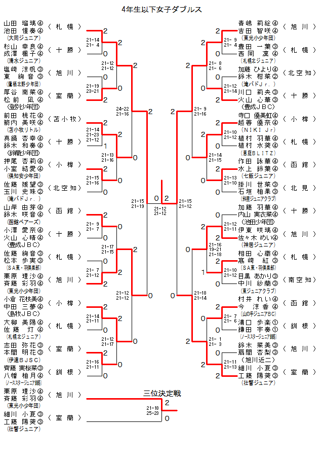 | 4GD-15 | 山の手Jr.BC・[函館] | 村井 れいC・今 涼香C | 2 | 21- 7 21- 6 | 0 | 溝口 歩楽@・鎌田 宇奏@ | ノーススターJr.釧路・[釧根] | |