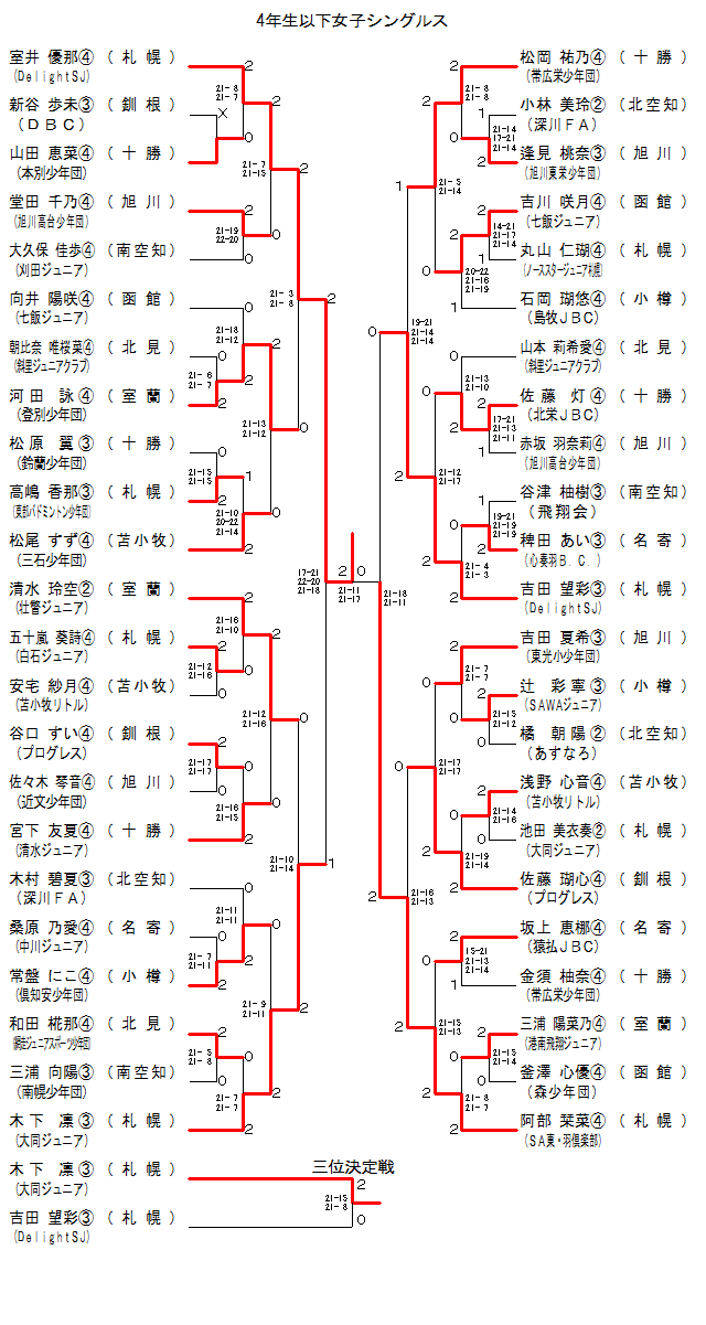 | 4GS-23 | 帯広栄少年団・[十勝] | 松岡祐乃C | 2 | 21- 8 21- 8 | 0 | 逢見桃奈B | 旭川東栄少年団・[旭川] | |