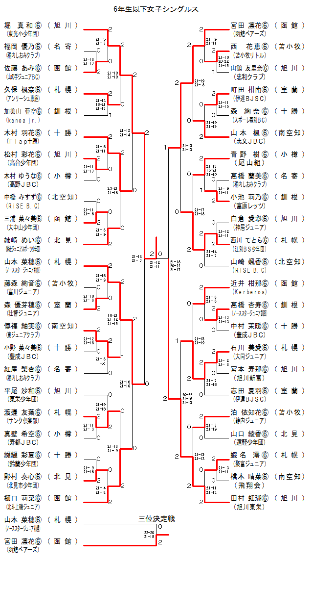 | 6GS-19 | ノーススターJr.札幌・[札幌] | 山本菜穂E | 2 | 21-16 21- 9 | 0 | 森優芽穂E | 壮瞥Jr.・[室蘭] | |